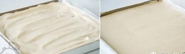 9、面糊倒入烤盤中,用刮刀推到四周,再用刮板抹平,放入烤箱中層180度烤15分鐘;
