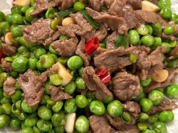 食材準備:牛肉、豌豆、蒜末、幹辣椒、白胡椒粉。