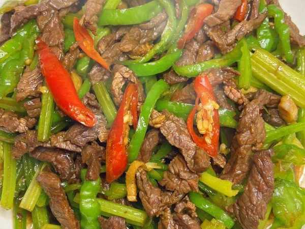 2.清洗幹凈青紅椒和芹菜,然後分別切好備用,再熱鍋燒油,油熱以後,放入醃制好的牛肉煸炒,煸炒至牛肉變色後,盛出備用。