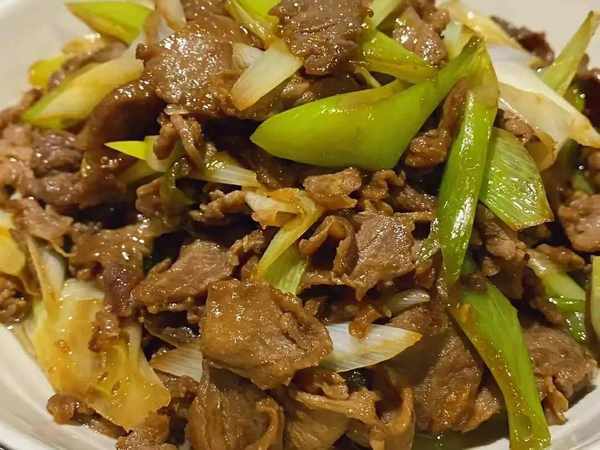 2.清洗幹凈大蔥,然後切成小段備用,接著熱鍋燒油,油熱以後,放入醃制好的牛肉煸炒,煸炒至牛肉變色後,盛出備用。