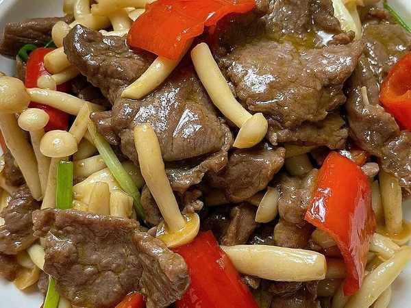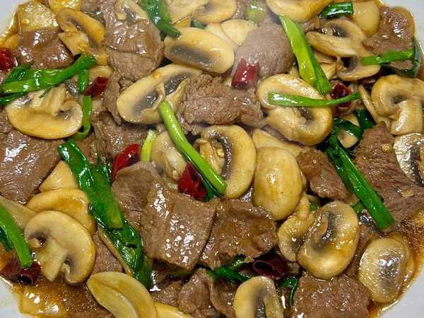 2.清洗幹凈口蘑,然後切成薄片備用,接著熱鍋燒油,油熱以後,放入醃制好的牛肉煸炒,炒至牛肉熟透後,盛出備用。