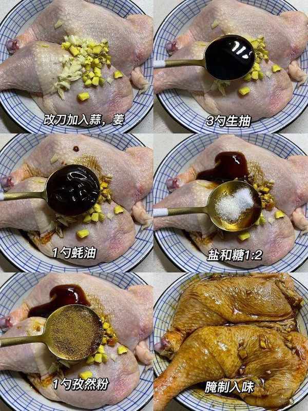 2.將雞腿放入大碗中,加入適量鹽、黑胡椒粉、辣椒粉進行醃制,時間控制在半小時至1小時之間,以便雞肉充分入味。