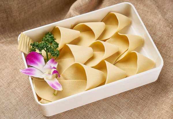 豆皮是以大豆面為原料,經過磨漿、攪拌、加熱、拉絲等工藝制作而成的。豆皮口感細膩,富有彈性,且易於入味,具有較高的營養價值,其蛋白質含量和營養價值都比一些肉類和海鮮更高。同時,豆皮還有很好的吸附性,能夠將其他食材的氣質和湯汁充分吸收,使得其口感更加鮮美。