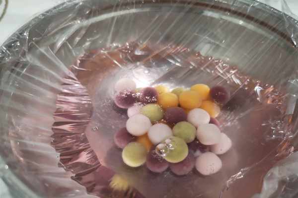 4、準備一張耐高溫的保鮮膜鋪在碗底,將過涼後的五彩糯米丸子放入。