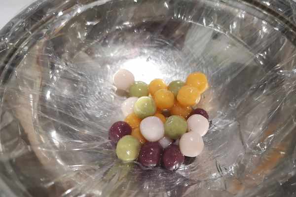 1、鍋內倒入適量水燒開,放入準備好的五彩糯米丸子,煮至浮起後撈出過涼。五彩糯米丸子可以提前做好放入冰箱冷凍,隨取隨吃。