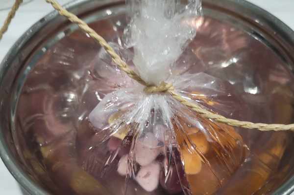 6、將保鮮膜包起來,用繩子紮緊,吊起來。?
