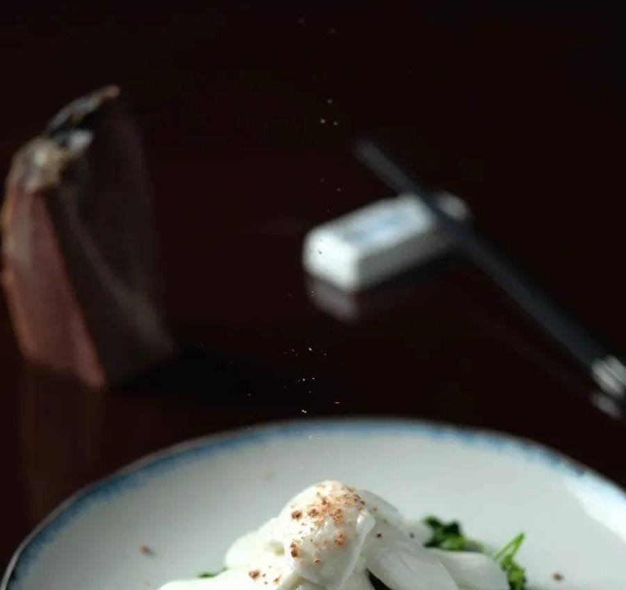 3、鍋留底油,下馬蹄蔥煸香,加少許清雞湯、鹽調味,下魚片,勾芡後淋明油,出鍋碼盤,撒火腿末即可。