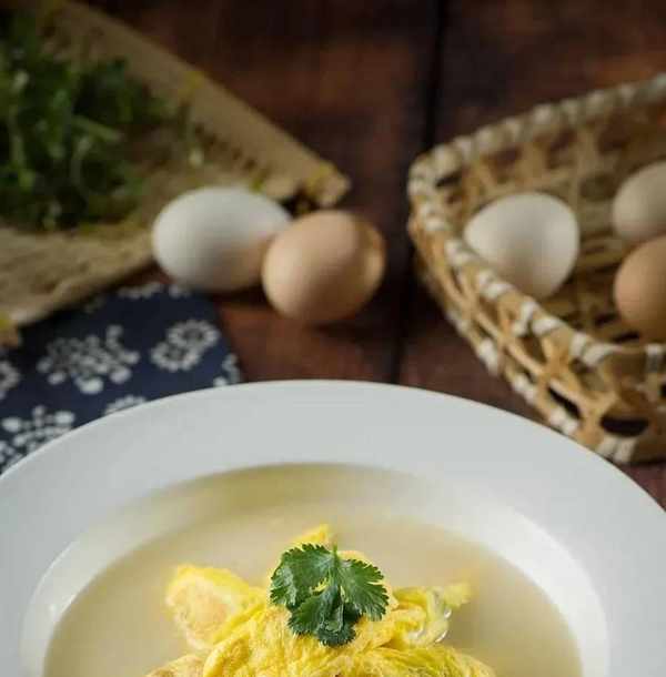 3、另起凈鍋,入大骨湯,下蛋餃,加鹽、白糖、胡椒粉燒開,出鍋碼盤,點綴香菜葉即可。