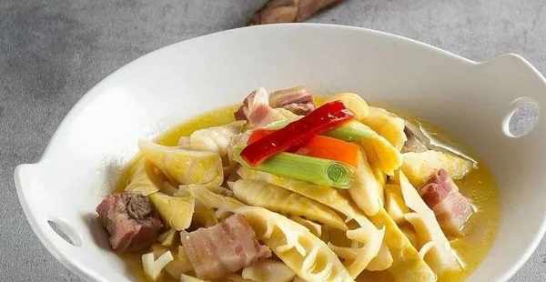2、鍋入菜籽油燒熱,下薑片、臘肉塊炒出香味,加雞湯,下春筍塊,以文火煨1小時,加雞粉調味,出鍋前加紅椒條、青蒜段,碼盤即可。