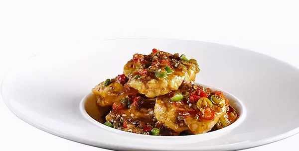 3.鍋裡留底油,先下鹽菜末、豬肉末、榨菜末、郫縣豆瓣、青紅小尖椒粒、蒜粒和薑粒,炒香才放入炸好的茄夾,等到陸續加放生抽、白糖、醬油、味精、醋、紅油和花椒油翻炒均勻,再起鍋裝盤上桌。