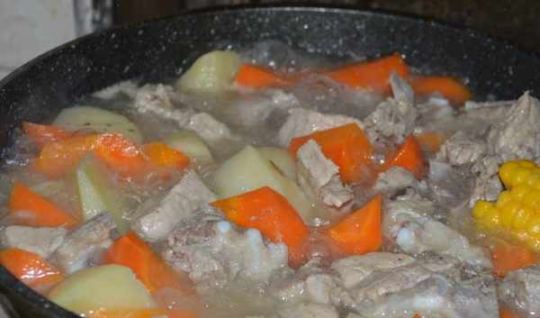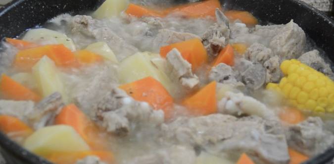 6、然後我們在把排骨倒入鍋中,在往鍋中倒入涼白開,把自己喜歡的食材倒入鍋中,在這裡我準備的是土豆,還有胡蘿卜,倒入食材之後我們開大火,將鍋中的水煮開。鍋中的水煮開之後呢,我們在關小火慢慢地燉煮20分鐘的時間,這樣一道美味的燉排骨就完成瞭。