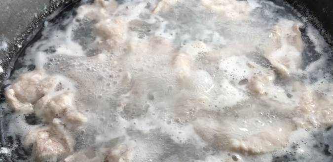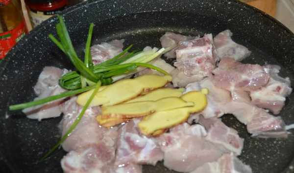 鍋中倒入排骨之後,我們再將提前切好的生薑還有蔥花一起放入鍋中,生薑和蔥花不僅可以蒸箱,同時還可以去除排骨的腥味,然後開大火將鍋中的水煮開。這個時候我們可以看到鍋中有很多的浮沫,我們就用勺子將多餘的浮沫給舀出來。第二個關鍵的點就是撇去排骨的浮沫,這裡也是排骨腥味的來源,因為這些浮沫也就是排骨內部排出來的血水。浮沫全部撇幹凈之後,我們再開火,煮制一分鐘的時間就可以將排骨撈出來瞭。