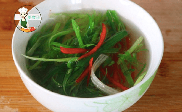 4、把準備好的蔥絲、紅椒絲、薑絲也放入碗裡,加水浸泡。(泡水後的蔥絲和紅椒絲淋熱油的時候卷起來賣相會更好看)。