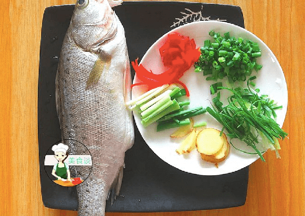 食材:新鮮的鱸魚、生薑、蔥、紅椒。