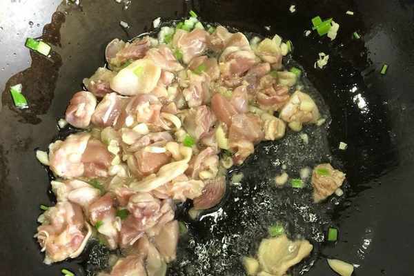 6、然後把醃制好的雞腿肉放入鍋中煸炒一下,直到雞肉炒到發白瞭就可以瞭。