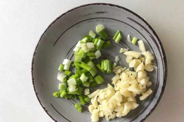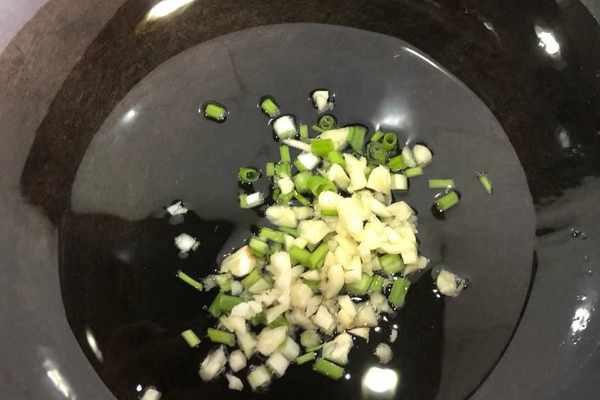 5、鍋中加入適量的食用油燒熱,然後將切好的蔥花和大蒜末放入鍋中煸炒一下,直到炒出香味就可以瞭。