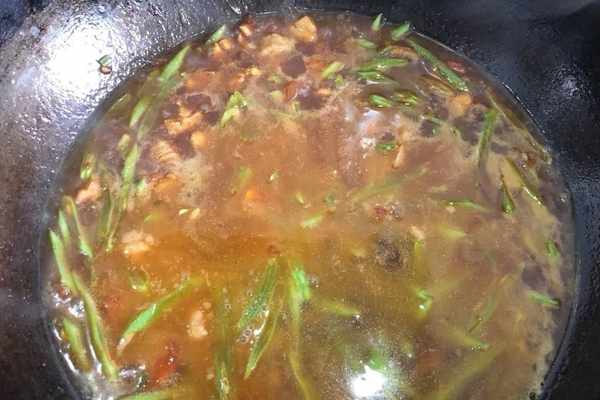 10、蓋上鍋蓋小火燜燉,時間差不多瞭,打開鍋蓋,這個時候的面條已經軟爛入味瞭,湯汁也收得差不多幹瞭就可以關火瞭,用筷子將面條翻拌一下就可以出鍋瞭。