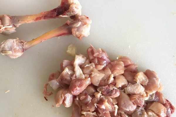 1、首先準備好燜面要用的所有食材,兩隻雞小腿,然後將雞小腿肉剔下來,這個是個耐心的活,大傢做的時候要小心仔細一點,剔下來的雞肉切成小丁備用。