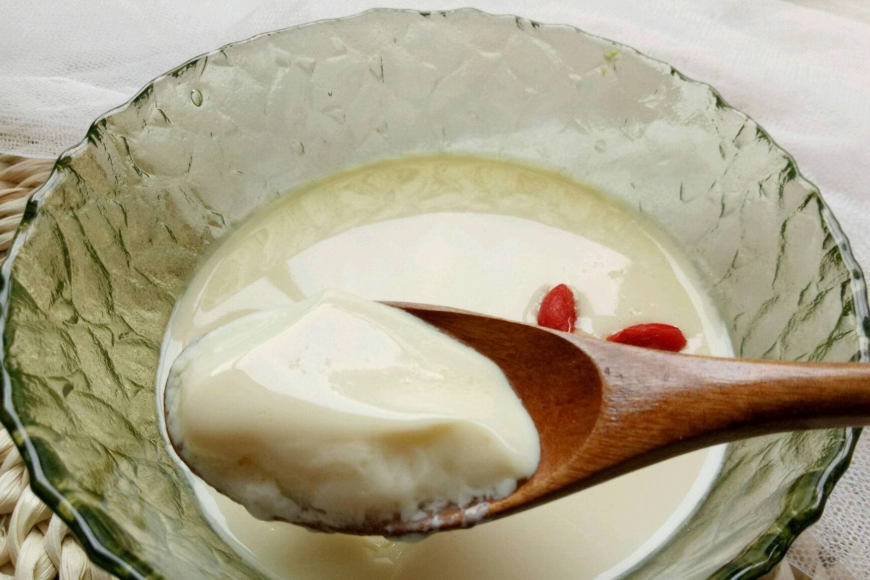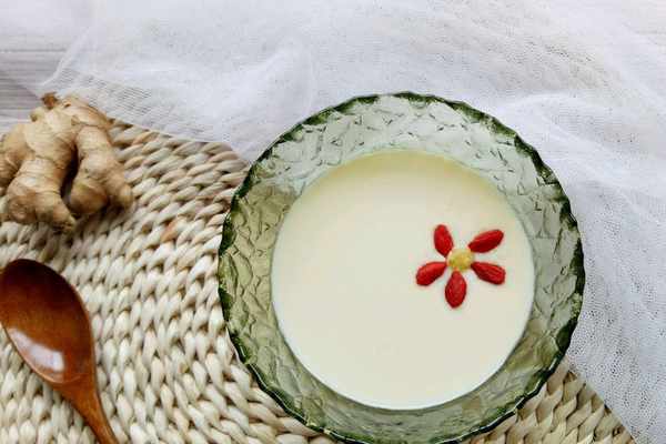 6、想要樣子更好看的小夥伴,可以像圖片裡一樣,用枸杞裝飾一下薑撞奶,枸杞要提前浸泡洗幹凈哦。或者放上自己喜歡的小裝飾品,不僅美觀,而且既美味又可口,從此以後吃薑再也不是什麼難事啦!