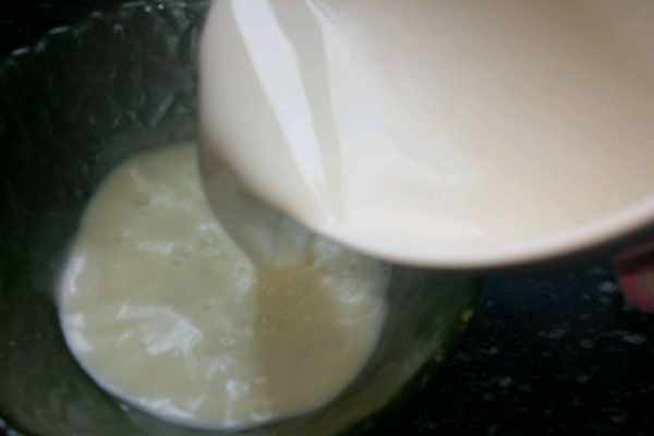 5、拿出來以後把牛奶快速沖入薑汁裡,蓋上蓋子燜十分鐘就可以瞭,悶得時候註意不要被牛奶燙到手,香滑的薑撞奶就做好瞭。