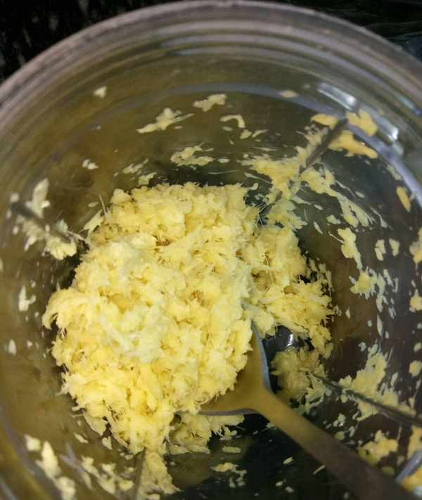1、老薑去皮切塊,不要切太大塊,放在料理機裡打成薑蓉。