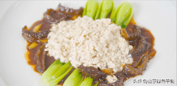 海參在我們食材中是一個上品之物,戰國時期就已有記錄,那時候海參還叫土肉。這道菜是雞和海參一起烹飪的,看起來非常的清雅,沒有其他雜色,生的雞脯肉切丁,煨制,用雞的香味包裹住海參,氣質非常特別。