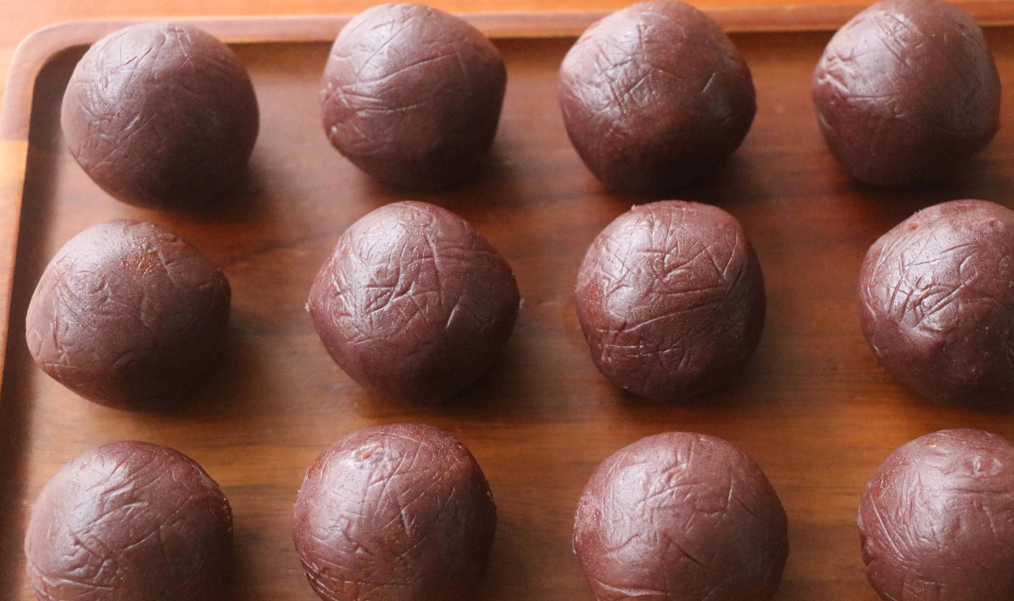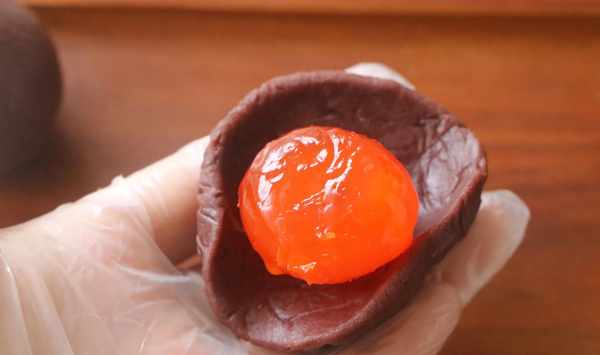 3、提前準備好豆沙,大約25克的豆沙包入一個咸蛋黃;