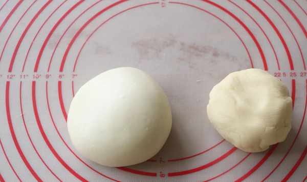 1、先來做水油皮面團和油酥面團。油酥面團材料混合之後揉成面團,放在冰箱冷藏15分鐘左右;水油皮面團材料混合,揉成光滑的面團,最好揉出厚膜,這樣蛋黃酥不會破皮混酥,放冰箱冷藏15分鐘左右;