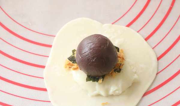10、取一個醒發好的面劑,用手指從中間按壓一下,把兩頭折回來,輕輕搟薄,先放一點麻薯,再放適量的肉松,最後把豆沙蛋黃放上去;麻薯肉松的部分也可以包在豆沙裡面,隻是不要包得太多瞭,不然烤的時候會爆開;