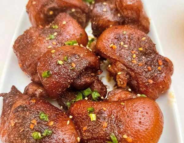 5、鹵好得豬蹄放入烤盤或者空氣炸鍋,刷上油和孜然粉,海椒面,燒烤料,開200度的大火烤20分鐘左右,出鍋撒上芝麻和蔥花,美味的豬蹄就烤好瞭!