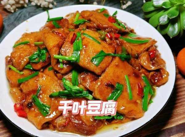 3、鍋留底油放入準備好的薑蒜和少許青紅椒圈炒香,倒入我們事先準備好的千葉豆腐,大概翻炒20到30秒之後,放入1勺老抽、生抽,少許蠔油,適量鹽和雞精。
