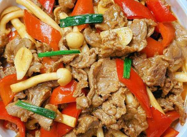 3、熱油下薑蒜片紅辣椒翻炒,倒入牛肉跟海鮮菇、1勺蠔油、1勺生抽翻炒,加蔥段翻炒均勻即可