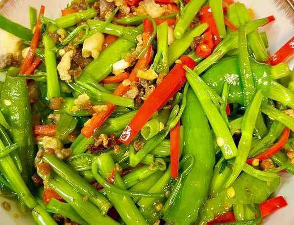 食材:空心菜梗、豬肉沫、青椒、紅椒、蒜米2顆