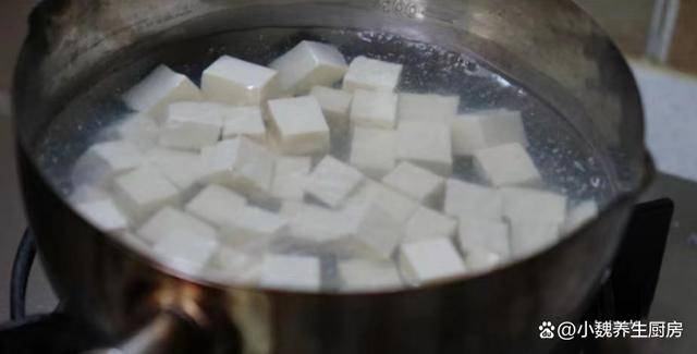 第四步:豆腐用冷水沖洗,改刀切成若幹小方塊,起鍋繼續煮一些清水,煮沸後倒入豆腐塊,焯水2分鐘左右,去掉豆腐的豆腥味,撈出備用。