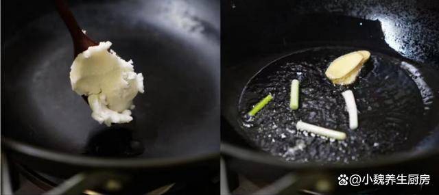 第五步:鍋底提前預熱一會兒,加上少許豬油融化開(用豬油湯汁更美味),放入一些蔥段和薑絲,快速翻炒30秒左右。