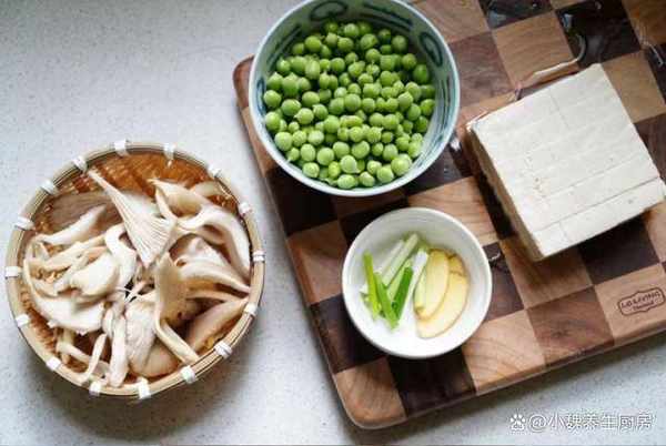 第一步:提前選購好青豌豆,嫩豆腐和平菇,生薑去皮洗凈切片,然後切成若幹細絲,小蔥切成小段,備用。