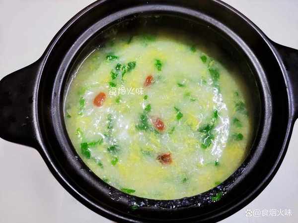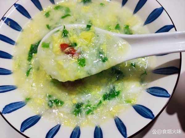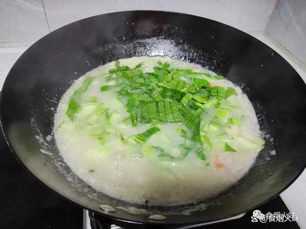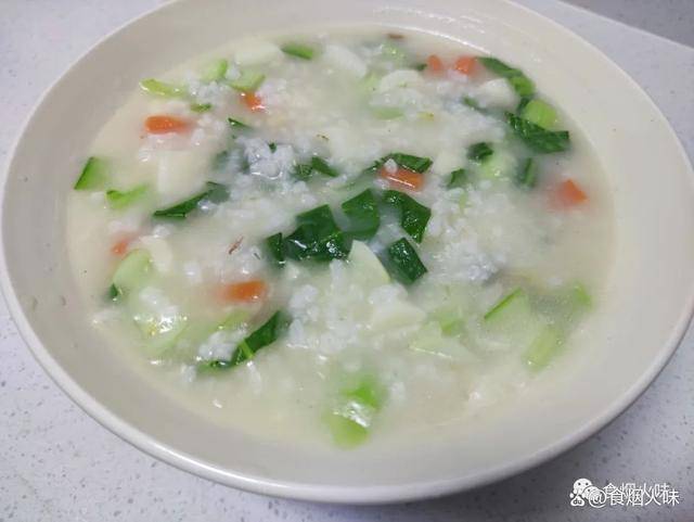 4.鍋中的粥熬成下面這一種濃稠狀,可以用勺子舀起來看一下鍋裡面的米花已經開瞭,這種狀態比較適合。接著倒入切好的蘿卜丁,再次煮個5分鐘左右,接著加入青菜攪拌均勻即可出鍋。