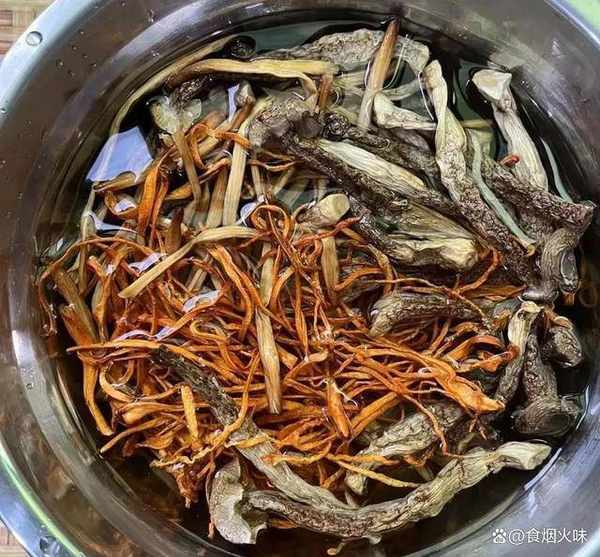 2.鹿茸菇,蟲草花,黃花菜放在盆中,裡面加入適量的溫水,用溫水將鍋中的食材泡發。泡發後用清水洗兩三遍,洗幹凈後撈出放在一旁備用;