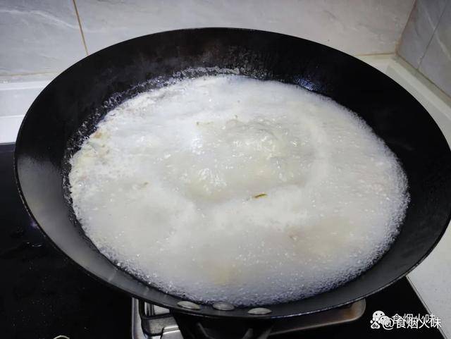 3.鍋中的大米炒香後,我們往裡面倒入適量的水。大火鍋中的水開後,我們用勺子攪動一下,以免粘鍋,然後用小火慢慢熬,熬煮半個小時裡面的湯汁變得濃稠;