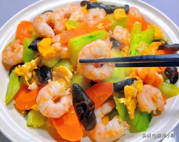 (4)鍋底留油下入蝦仁,小火慢炸至變色,依次下入胡蘿卜、木耳、黃瓜翻炒。