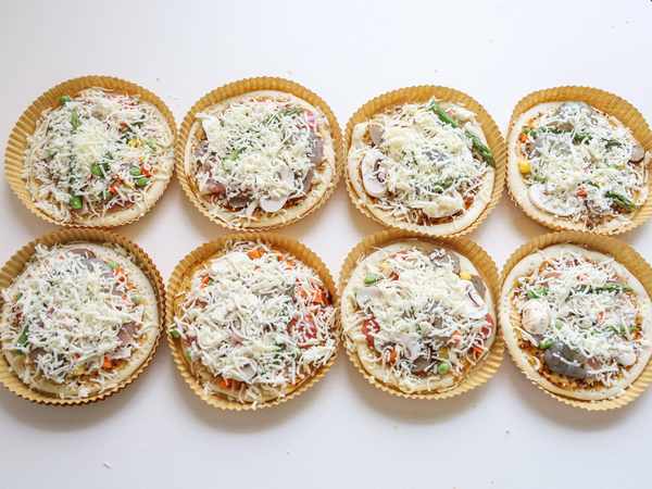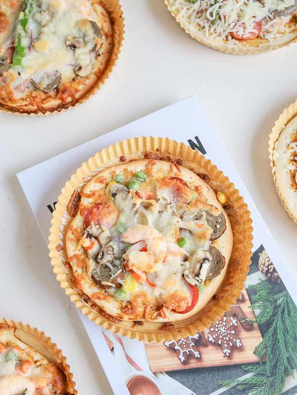 披薩在我們傢裡倒是經常做的,一般都是做一個大尺寸的。薄而韌的餅皮,拉絲的芝士,豐富多變的配料,太適合當主食或者下午茶瞭,今天試著去做瞭一款一人食的迷你披薩,迷你披薩還可以一次做各種口味。