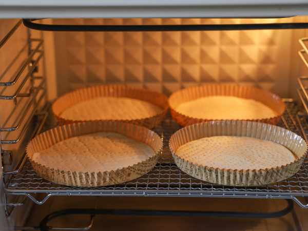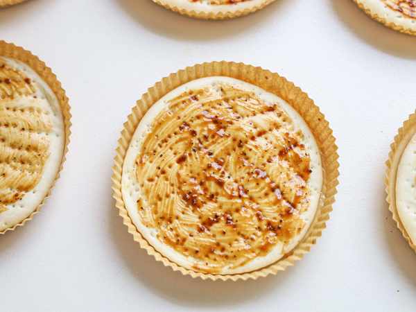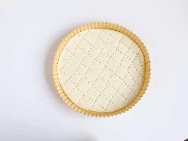 5.面條搟成圓片放入4寸紙模中,用叉子紮孔,醒發10分鐘