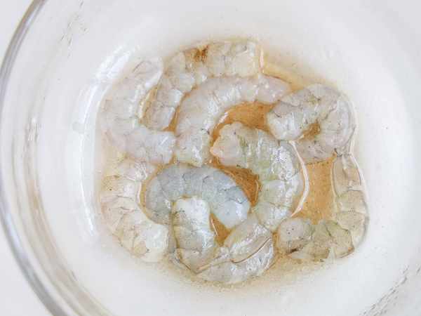4.蝦仁去殼去蝦線,用料酒、胡椒鹽醃制20分鐘去腥提味