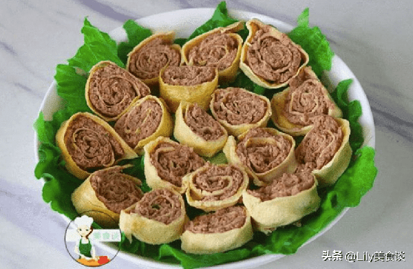 5、雞蛋皮上均勻的塗抹上一層豬肉餡,然後卷起來。