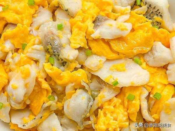 3、起鍋燒油,油熱後放入醃制好的鱸魚翻炒至變色,再倒入雞蛋液煎一下,煎至凝固後,用鍋鏟慢慢推動,炒熟炒至定型,撒上蔥花即可出鍋開吃。