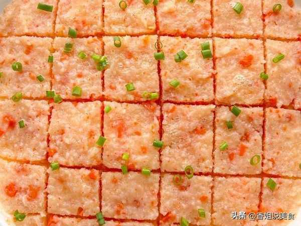2、接著放入胡蘿卜丁和淀粉,攪拌均勻至上勁,然後鋪在蒸盤中,整理平整。冷水上鍋蒸十五分鐘。
