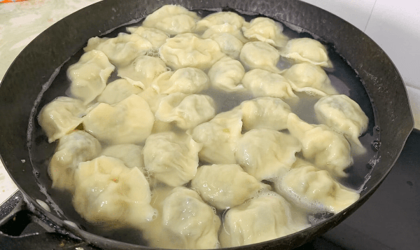 5、鍋中加入清水少許的鹽,(加鹽可以防止餃子皮在煮制的過程中破皮)水開後下入餃子,一邊下一邊推動防止餃子粘鍋,待水沸騰後加入少許涼水,餃子一共“滾”三個水開,就可以用漏勺取出來瞭。