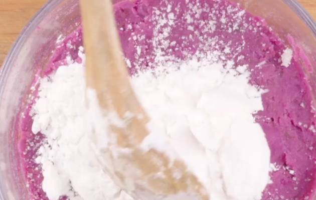 第二步:在裝有三種食材的碗中分別加入6g白砂糖和120g的木薯淀粉,均勻攪拌,揉捏成團,如果太幹的話,可以適當加少量的涼白開。