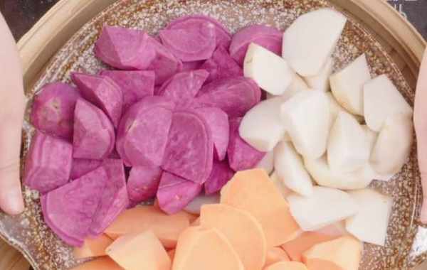 第一步:首先把準備好的紅薯,紫薯,芋頭分別去皮,滾刀切塊,而後準備三個盤子,分別放上三種食材,直接冷水上蒸鍋,大火蒸煮20分鐘後取出碾成泥。