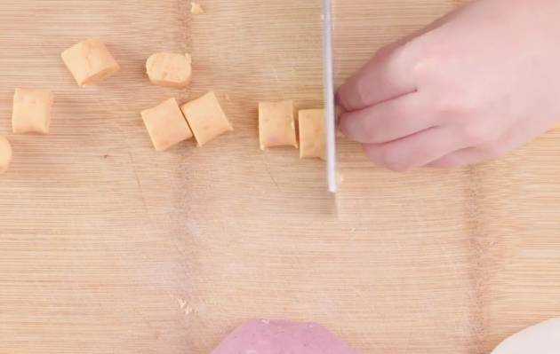 第三步:然後把木薯團分別搓成直徑1cm左右的長條,切出15g左右等分的小劑子備用。